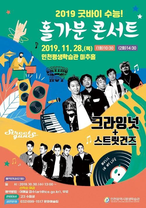 인천평생학습관은 2019학년도 대학수학능력시험을 마친 고3 수험생들을 격려하고자 오는 11월 28일미추홀에서 “2019 굿바이 수능 홀가분 콘서트”를 개최한다고 밝혔다.