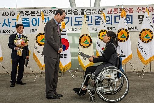 사)한국교통장애인협회 동두천시지회 김태수 회장은 지난 16일 수원 월드컵경기장에서 한국교통장애인협회 경기도협회 주최로 열린 ‘2019년 교통사고 줄이기 경기도민 결의대회’에서 ‘경기도북부지방경찰청장상’을 수상했다.