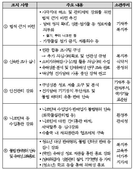또한, 청소년 흡연 유발 등 공중보건에 악영향을 미치는 경우에는 제품회수, 판매금지 등 조치를 할 수 있도록 국민건강증진법 개정을 추진한다.