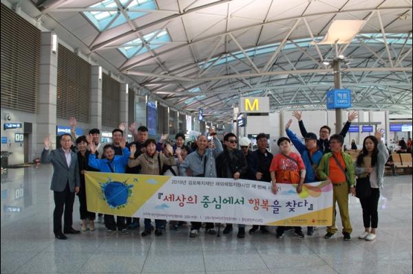 김포복지재단과 관내 사회복지시설 이용자들이 지난 22일 인천공항에서 ‘괌’으로의 사회복지시설 이용자 해외체험지원사업 출정식을 가졌다.