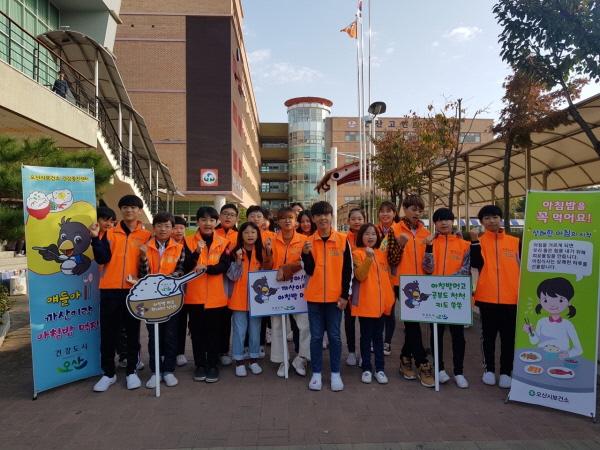 오산시보건소는 성장기 아이들의 아침밥 먹기 실천율을 높이기 위해 지난 22일 오산고현초등학교에서 교직원, 학생들과 함께 ‘모두 다 건강점프’ 슬로건으로 아침밥 먹기 캠페인을 실시했다.