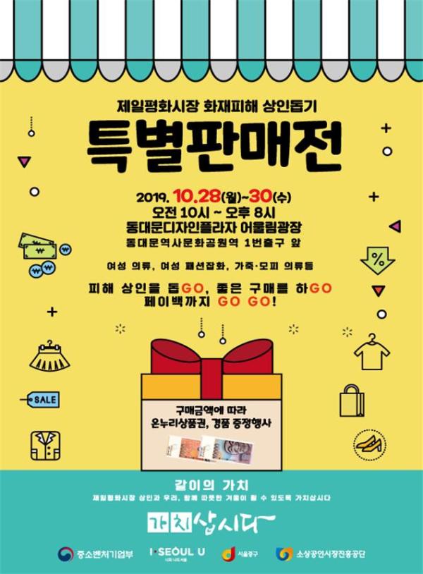 중소벤처기업부와 서울특별시 중구청은 오는 28일부터 30일까지 3일간 동대문 디자인 플라자 어울림 광장에서 ‘제일평화시장 화재 피해 상인 돕기 특별 판매전’을 개최한다.