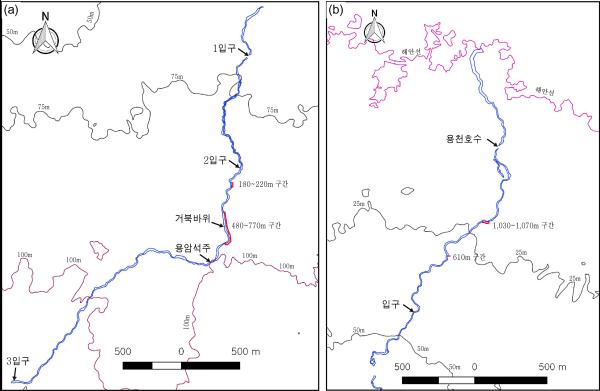 용천동굴의 경우, 동굴입구에서 용천호수 방향으로 610m 지점 1곳과 1,030~1,070m 구간 4곳에서 벽면의 오른쪽에서 다량의 벽면유출수가 관찰됐다.