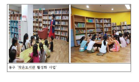 동구는 ‘작은도서관 운영 활성화 사업’을 통해 작은 도서관에 6명의 독서지도사 등 전문인력을 배치해 독서문화 확산과 도서관 운영 활성화를 도모하고 있다.
