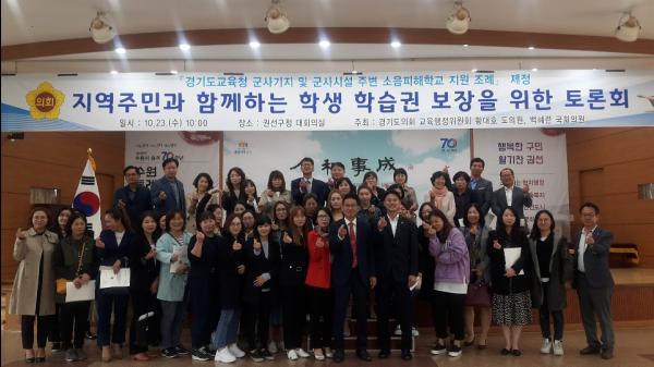 경기도의회 교육행정위원회 황대호 의원이 대표발의해 지난 1일 공포된 ‘경기도교육청 군사기지 및 군사시설 주변 소음피해학교 지원 조례’ 시행에 따라 구체적인 지원방안 모색을 위한 ‘지역주민과 함께하는 학생 학습권 보장을 위한 토론회’가 23일 수원시 권선구청 대회의실에서 백혜련 국회의원, 황대호 의원 공동주최로 120여명이 참여한 가운데 성황리에 개최됐다.