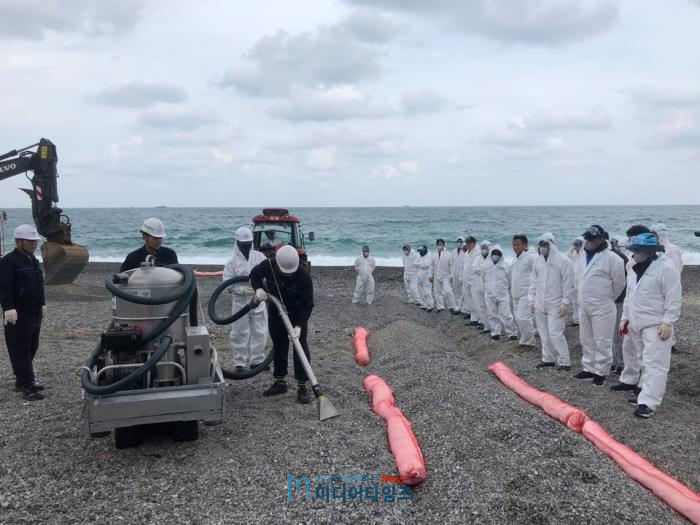 훈련은 운항 중이던 선박(유조선, 화물선) 2척이 운항 부주의로 충돌해 연료유(벙커C유) 10㎘가 유출되어 경주지역 해안가에 부착된 상황을 가정하고, 방제현장에서 방제장비(비치크리너, 고압세척기 등)를 이용한 기계적 방제와 인력(자원봉사자)을 동원한 해안유입 기름 제거훈련을 진행했다.
