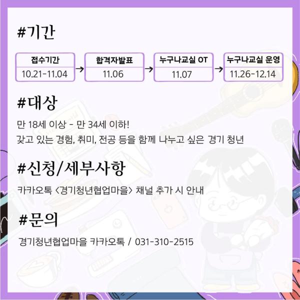 시흥시가 운영하는 청년센터인 경기청년협업마을에서 오는 11월 4일까지 청년 누구나 교실 하반기 참여자를 모집한다.