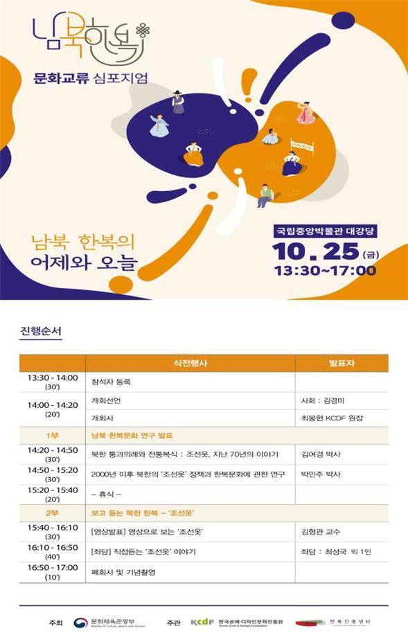 문화체육관광부는 한국공예·디자인문화진흥원 한복진흥센터와 함께 오는 25일 오후 2시부터 5시까지 국립중앙박물관 대강당에서 ‘남북 한복문화의 어제와 오늘’을 주제로 ‘2019 남북 한복문화교류 심포지엄’을 개최한다.