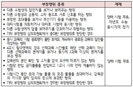수능 시험장에서 다음과 같은 행위를 할 경우에는 수능 부정행위로서 엄정한 제재를 받게 되므로, 수험생은 반드시 이 점에 유의해야 한다.