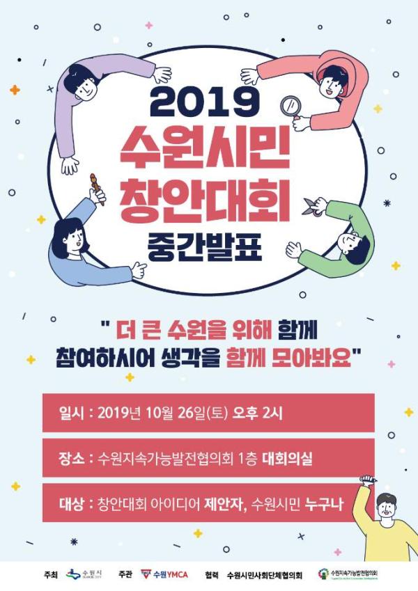 수원시는 오는 26일 오후 2시 수원지속가능발전협의회 대회의실에서 ‘2019 수원시민창안대회 중간 발표회’를 연다.