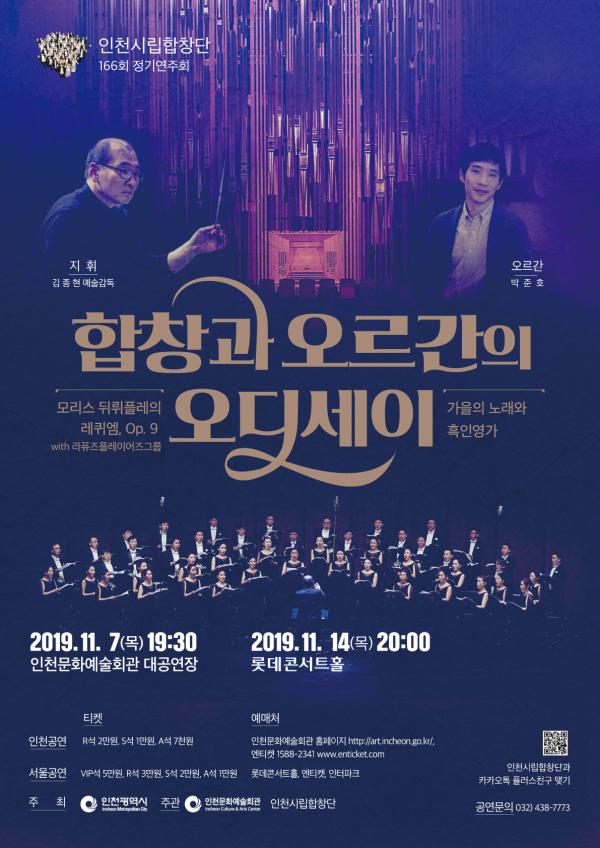 인천시립합창단의 제166회 정기연주회 ‘합창과 오르간의 오디세이’는 11월 7일에는 인천문화예술회관 대공연장에서 11월 14일에는 롯데콘서트홀에서 관객들을 만난다.