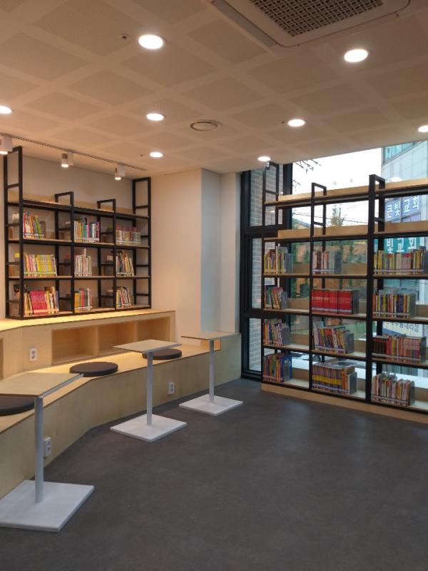상동어울마당 작은도서관은 상동어울마당 2층에 있으며 열람 및 문화프로그램 공간과 노트북 존, CD존으로 구성되어 있다.
