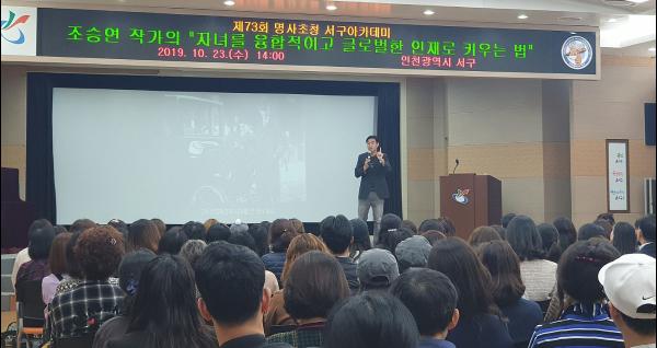 인천 서구는 지난 23일 서구청 대회의실에서 주민 250여명이 참석한 가운데, 조승연 작가를 초청해 “자녀를 융합적이고 글로벌한 인재로 키우는 법”이라는 주제로 제 73회 명사초청 서구아카데미를 개최했다.