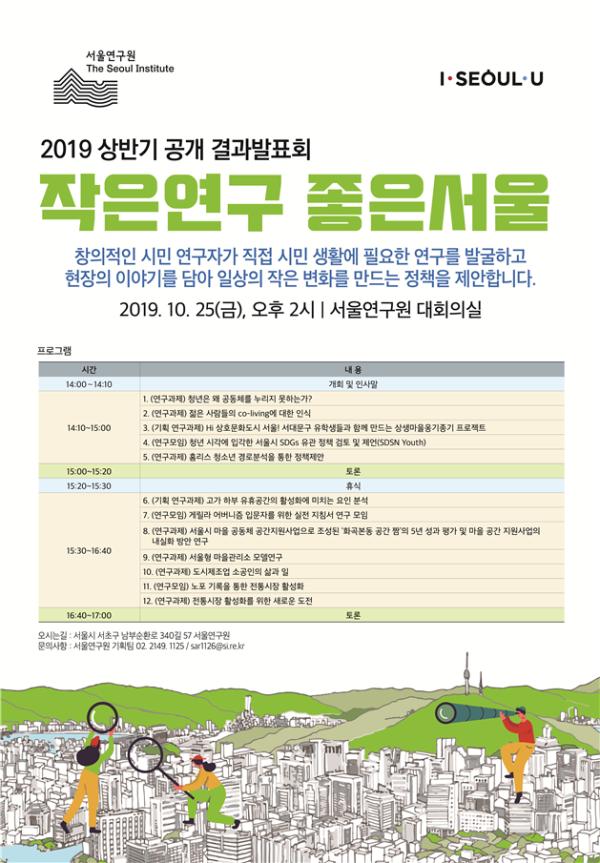 서울연구원은 오는 25일 오후 2시 서울연구원 대회의실에서 2019년 상반기 ‘작은연구 좋은서울’ 사업 결과발표회를 개최한다고 밝혔다.