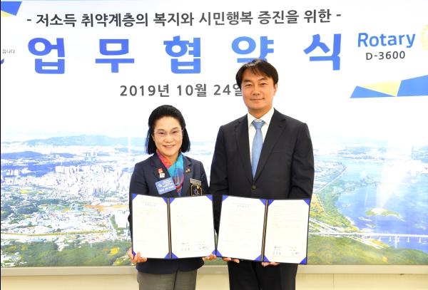 하남시는 24일 시청 시장실에서 국제로타리 3600지구와 저소득 소외계층 복지증진을 위한 업무협약을 체결했다