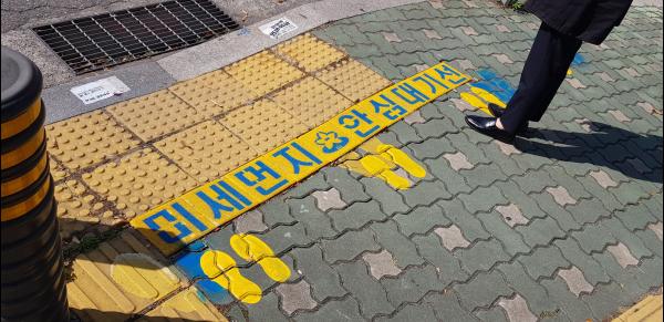 신호 대기 중일 때 도로에서 1.5m 떨어져 있는 노란색 발자국 모양에 물러서 있으면 도로 재비산먼지의 영향을 덜 받을 수 있다.