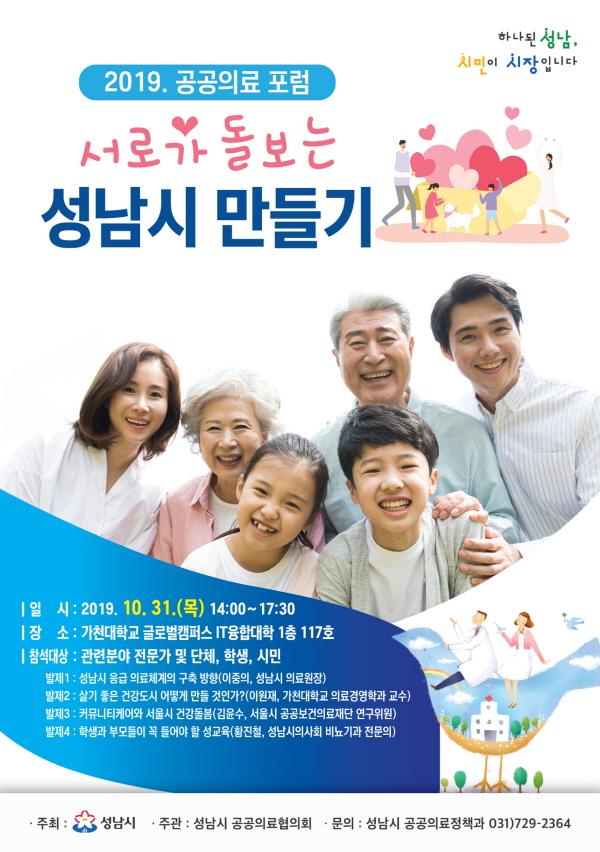 성남시는 오는 31일 오후 2시 가천대학교 글로벌캠퍼스 IT융합대학에서 ‘서로가 돌보는 성남시 만들기’를 주제로 한 공공의료 포럼을 연다.