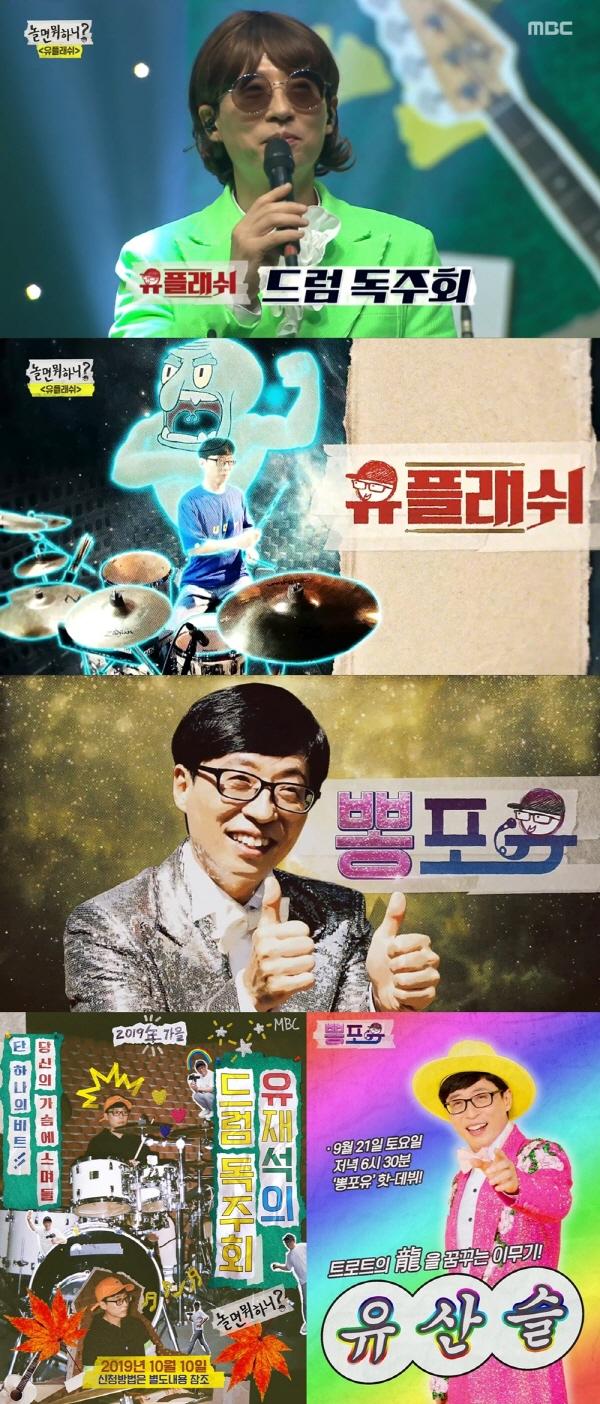 이번 주 방송에는 ‘유플래쉬’와 ‘뽕포유’를 한 번에 만나볼 수 있다. ‘드럼 독주회’서 감동의 클라이맥스을 선사한 유재석-신해철-이승환-하현우의 ‘STARMAN’ 작업 과정과 무대, 그리고 ‘뽕포유’ 트로트 신인 유산슬과 대세 송가인의 만남 현장도 함께 공개된다.