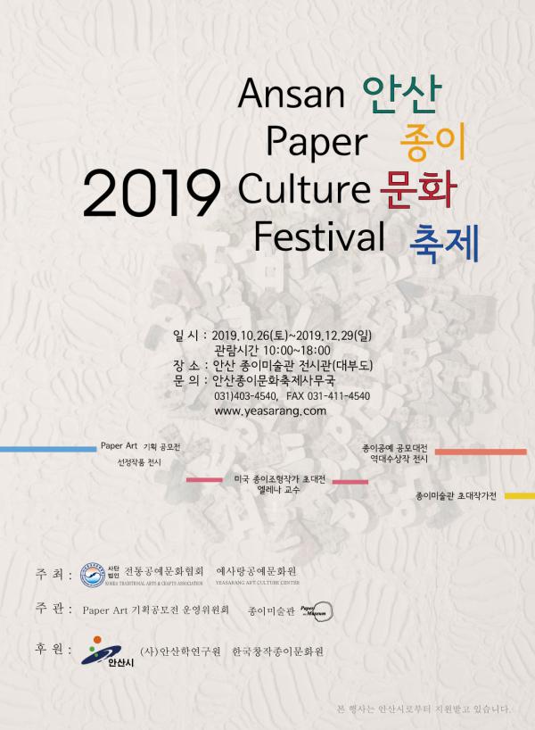 안산시는 우리나라 전통종이 공예를 널리 알리고 우수한 종이공예 작품 감상기회를 제공하기 위해 ‘2019 안산종이문화축제’를 ㈔전통공예문화협회 예사랑공예문화원의 주관으로 오는 26일 대부도 종이미술관에서 개최한다고 25일 밝혔다.