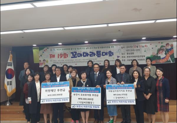 부천시 어린이집연합회는 지난 16일 제19회 꼬마마라톤대회 모금액 1000만 원을 디딤씨앗통장 후원금으로 사용해달라며 부천시에 전달했다. 대회는 아프리카돼지열병 확산 방지를 위해 취소됐으나, 어린이집 아동과 학부모가 대회를 위해 모금을 해준 것에 대한 감사의 마음을 전하기 위해 전달식을 마련했다.