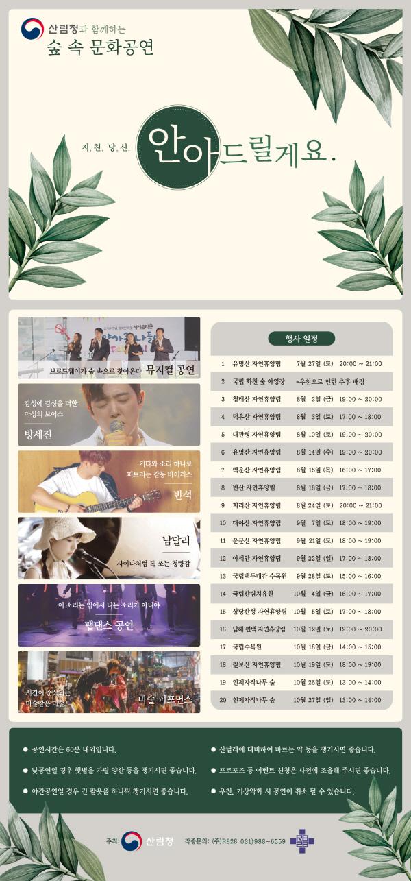 숲 속 문화공연은 국민들이 숲을 좀 더 가까이에서 친숙하게 느낄 수 있도록 산림청이 추진한 문화 공연으로 지난 8월 27일 경기도 가평 국립유명산자연휴양림에서 첫 공연을 시작해 총 20회의 공연이 전국 14개 자연휴양림과 국립수목원 등에서 진행됐다.