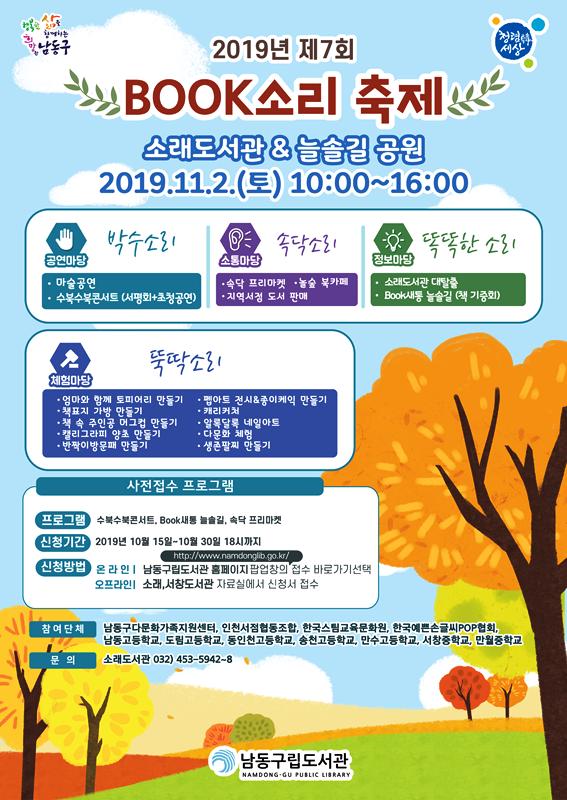 인천 남동구립도서관은 다음달 2일‘書로 만드는 행복, 남동구’ 독서운동과 발맞춰 ‘제7회 도서관 문화한마당 [BOOK소리 축제]’를 소래도서관과 늘솔길 공원에서 개최한다.