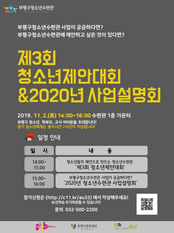 부평구청소년수련관는 오는 11월 2일 수련관 가온터에서 ‘제3회 청소년제안대회 및 2020년 사업설명회’를 진행한다.