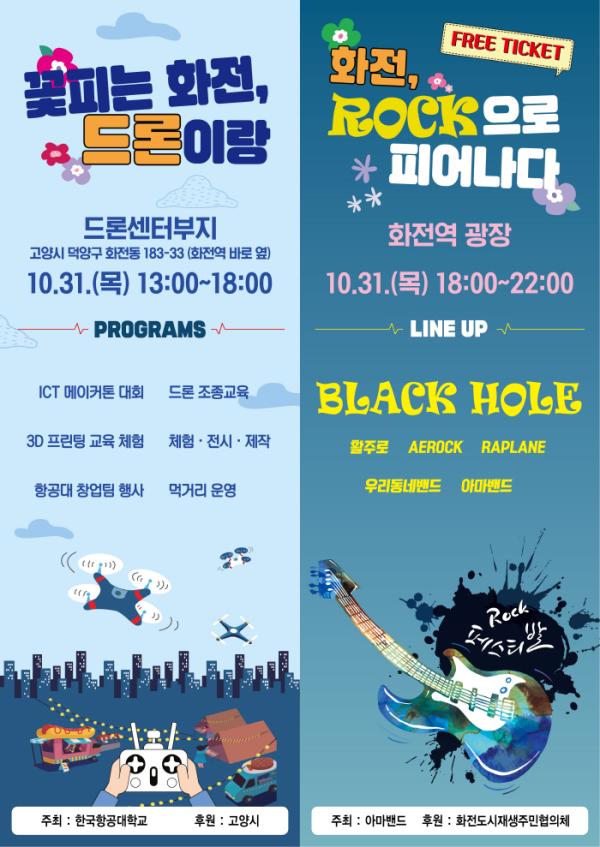 이어서 ‘화전, ROCK으로 피어나다’라는 주제로 진행되는 화전 제1회 락페스티벌은 화전도시재생 주민공모사업으로 참여하고 있는 아마밴드가 기획한 행사로 한국의 락밴드 ‘송골매’의 전신이 화전역에 인접한 한국항공대 밴드인 ‘활주로’임을 부각시키며, 항공대 락밴드와 주민밴드, 유명 락밴드‘블랙홀’이 함께해 아마추어 밴드와 유명 락밴드가 한 스테이지에서 음악으로 하나가 되는 흔치 않은 무대를 선보일 예정이다. 아마밴드 이주호 대표는 “지나친 상업화로 순수한 락 정신과 즐거움이 변질되어 가는 기존의 락페스티벌과는 달리 화전 락페스티벌은 무료로 진행된다”며 “주민들과 락 음악을 즐기는 시민들이 부담 없이 락밴드 음악을 즐길 수 있는 무대를 만들어 향후 화전 상가 활성화와 침체된 락 음악의 부활에 도움이 되었으면 한다”라고 취지를 밝혔다.