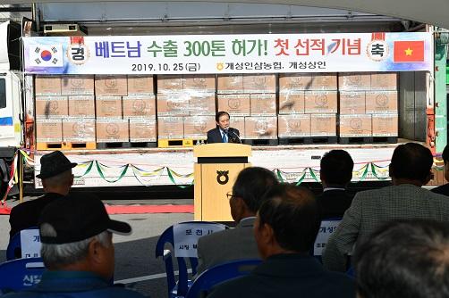 개성인삼농협이 조합 창립 이래 베트남 첫 수출을 개시한 가운데 25일 첫 선적을 축하하기 위한 기념식을 가졌다.
