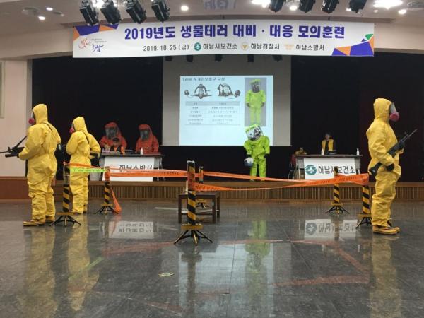 하남시보건소는 25일 시청 대회의실에서 하남경찰서, 하남소방서 합동으로 2019년 생물테러 대비·대응 모의훈련을 실시했다.