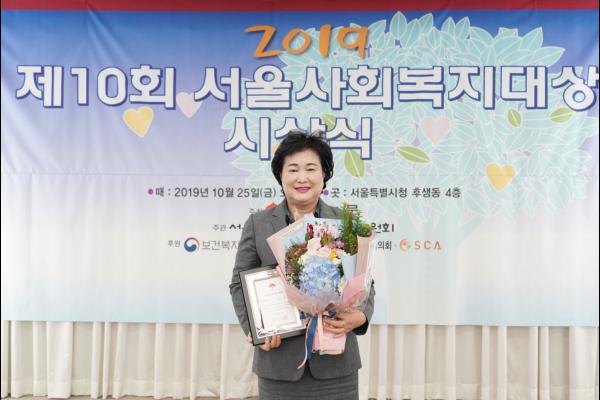 용인시의회 남홍숙 의원이 25일 오후 3시 서울특별시청 서소문별관 후생동 4층 강당에서 열린 ‘제10회 서울사회복지 대상‘ 시상식에서 서울복지신문 회장상을 수상했다.