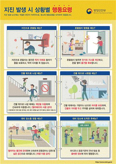 이번 훈련은 전 국민을 대상으로 지진옥외대피장소 사전확인 대피 전·후 지진발생 시 행동요령 및 생활안전교육 실시 실내 및 실외에서 실제 대피훈련으로 진행된다.