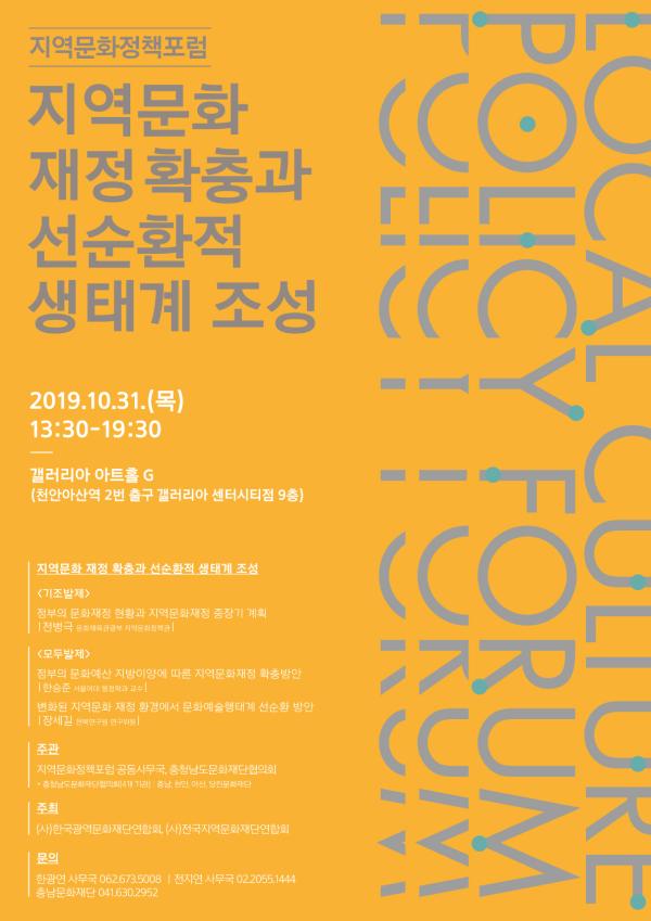 충남문화재단은 천안·아산·당진문화재단, 한국광역문화재단연합회, 전국지역문화재단연합회와 공동주관으로 오는 31일 천안 갤러리아 아트홀G에서 2019 지역문화정책 공동포럼 “지역문화 재정확충과 선순환적 생태계 조성”을 개최한다.