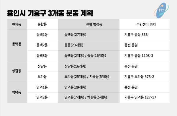 이에 따르면 ?동백동은 동백1, 동백2, 동백3동으로 ?상갈동은 상갈동, 보라동으로, ?영덕동은 영덕1, 영덕2동으로 각각 분동된다.