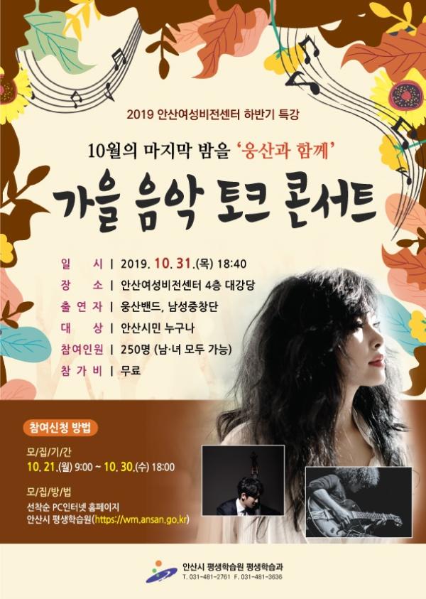 안산시 여성비전센터는 아름다운 음악과 함께 가을을 즐길 수 있는 ‘웅산과 함께하는 가을음악 토크 콘서트’ 특강을 개최한다고 28일 밝혔다.