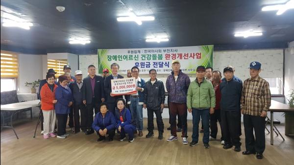 부천시는 지난 18일 한국마사회 부천지사가 장애인복지회 부천지부에 장애인어르신 건강돌봄을 위한 환경개선사업 후원금을 전달했다고 밝혔다. 전달식에는 장애인어르신 및 봉사자 약 40명이 참여했다.