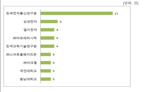 다출원인을 살펴보면 한국전자통신연구원 21건, 삼성전자 5건, 엘지전자, ㈜아모레퍼시픽 및 한국과학기술연구원은 4건, ㈜아크릴, ㈜스마트올웨이즈온, 국민대학교 및 충남대학교는 3건 순이다.