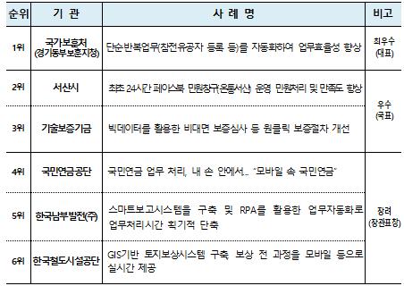 행정안전부는 지난 6월부터 중앙부처·지자체·공공기관을 대상으로 일하는 방식 혁신 우수사례 공모를 실시해 총 214건의 사례를 접수하고, 국민심사와 전문가 심사를 거쳐 6개 기관을 우수사례로 선정했다.