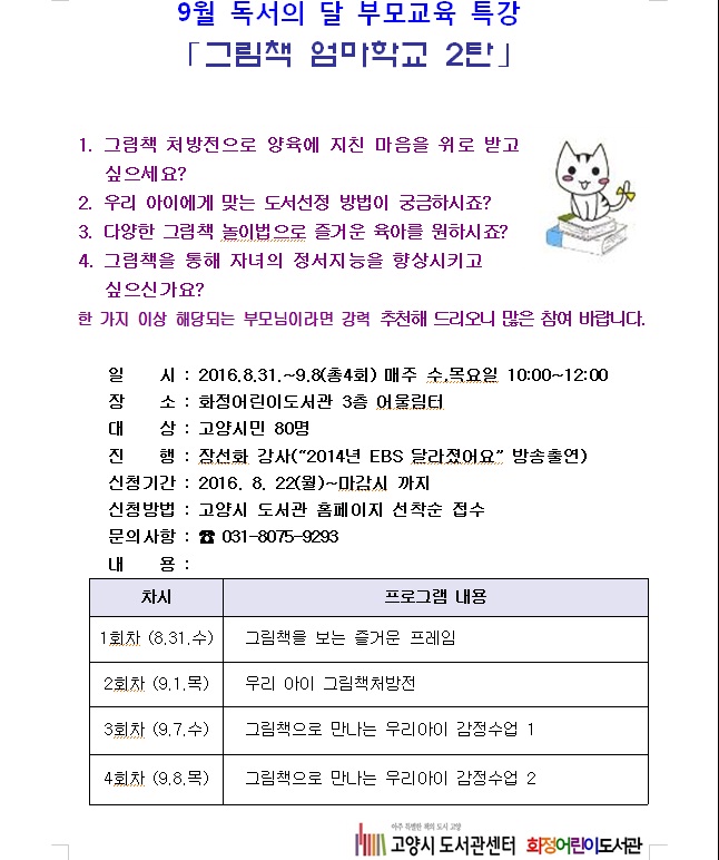 [미디어타임즈= 신정식 기자] 고양시(시장 최성) 덕양구 화정어린이도서관은 9월 독서의 달을 맞아 부모교육 특강 ‘그림책 엄마학교 2탄’을 운영한다.
