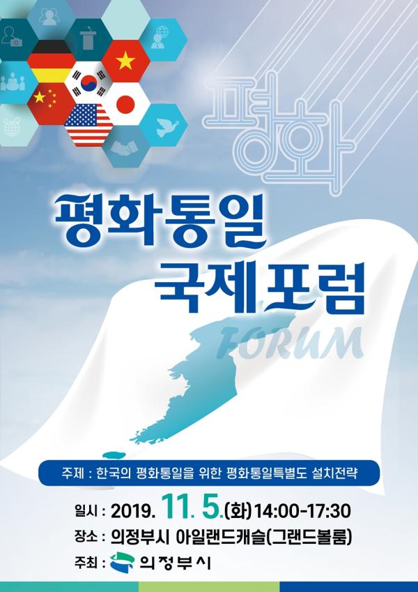 의정부시는 오는 11월 5일 의정부시 아일랜드캐슬에서 ‘한국 평화통일을 위한 평화통일특별도 설치전략 모색’을 주제로 전국 기초 지자체 중 최초로 5개국 유력 인사를 초청해 평화통일 국제포럼을 개최한다.