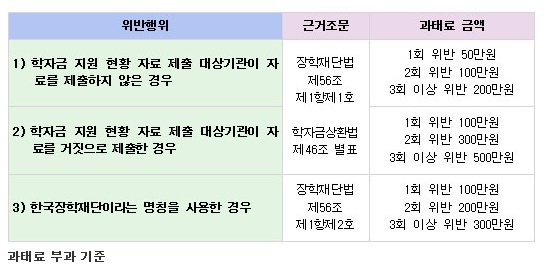 학자금 중복지원을 확인하기 위해 학자금 지원 현황 자료를 제출해야 하는 기관이 자료를 제출하지 않거나 거짓 자료를 낼 경우 부과되는 과태료 기준도 마련됐다.