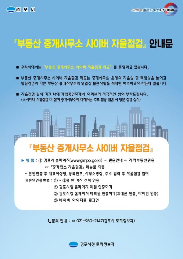 김포시는 부동산중개서비스의 전문성 향상을 위해 28일부터 ‘부동산중개사무소 인터넷 자율점검제’를 시행한다고 밝혔다.