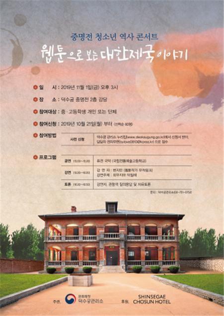 문화재청 궁능유적본부 덕수궁관리소는 청소년의 눈높이에 맞는 근현대사 교육프로그램인 ‘중명전 청소년 역사콘서트’를 오는 11월 1일 오후 3시부터 중명전 2층 강당에서 개최한다.