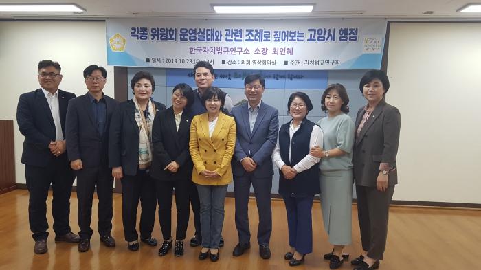 고양시의회(의장 이윤승) 의원 연구단체인 ‘자치법규연구회’는 23일 한국자치법규연구소 최인혜 소장을 초청해 시의회 영상회의실에서 ‘각종 위원회 운영실태와 관련 조례로 짚어보는 고양시 행정’이란 주제로 강연회를 개최했다.