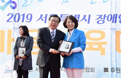 서울시의회 환경수자원위원회 김경영 의원은 지난 25일 오전 11시 서울시 도봉구 창골축구장에서 진행된 ‘2019년 서울특별시 장애인 한마음 체육대회’에서 장애인 일자리 안정 및 정착에 기여한 공로를 인정받아 서울시지체장애인협회로부터 감사패를 수상했다.