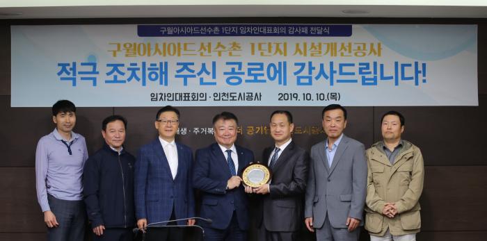 인천도시공사(사장 박인서)는 10일 구월아시아드선수촌1단지 아파트 임차인대표회의(회장 정중규)로부터 주요 시설개선공사 적극 조치 지원에 대한 공로로 감사패를 전달받았다고 밝혔다.