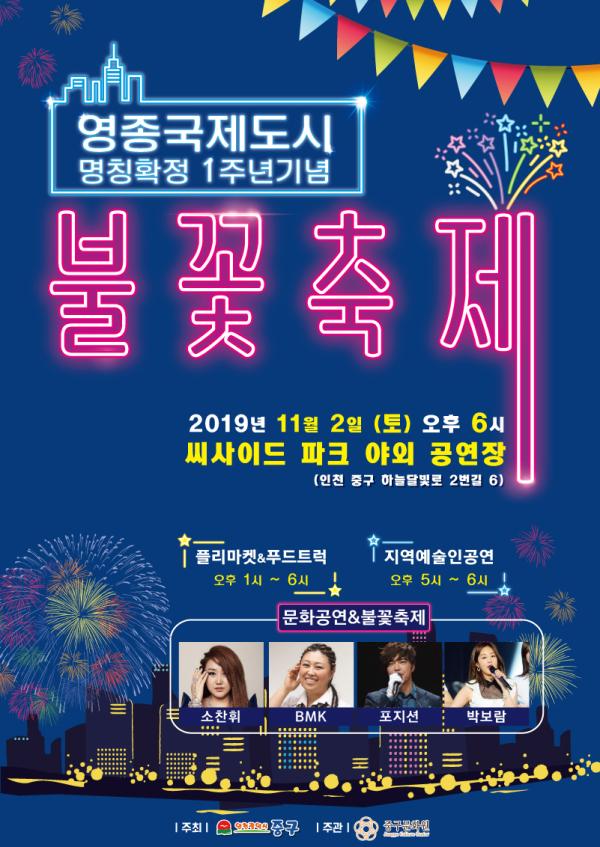 ‘영종국제도시 명칭확정 1주년기념 불꽃축제’는 오는 11월 2일 영종도 씨사이드파크 야외공연장에서 오후 1시부터 6시까지 플리마켓&푸드트럭 운영, 오후 6시부터 문화공연, 불꽃쇼 등이 진행될 예정이다.