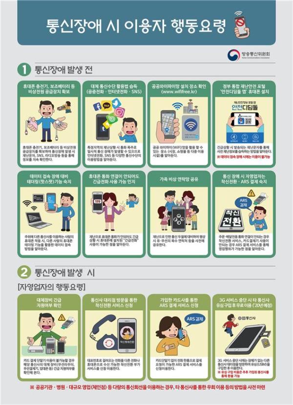 방송통신위원회는 통신장애 발생 시 국민들이 편리하게 활용할 수 있는 “통신장애 시 이용자 행동요령”을 마련해 29일부터 통신사 대리점 및 방송통신 이용자 전용 홈페이지 에서 안내·배포한다고 밝혔다.