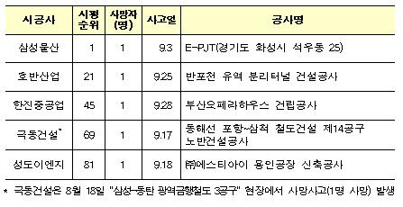 이 밖에 삼성물산, 호반산업, 한진중공업, 성도이엔지 현장에서도 각각 1명의 사고사망자가 발생하는 등 9월 한 달 동안 시공능력평가 상위 100위 중 5개 회사에서 5명의 사고사망자가 발생했다.