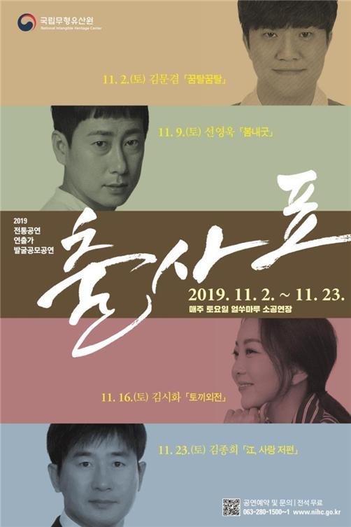 문화재청 국립무형유산원은 오는 11월 2일부터 23일까지 매주 토요일 오후 4시 국립무형유산원 얼쑤마루 공연장에서 전통공연 연출가 발굴 공모를 통해 선정된 ‘2019 출사표’ 공연을 개최한다.